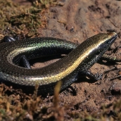 Escíncido de longitud media cabeza-cuerpo de 87 mm en los machos y 91 mm en las hembras, con dimensiones totales de 180 mm. Tiene una llamativa coloración dorsal, pardo-dorada o cobriza, muy brillante, con manchas longitudinales más ...